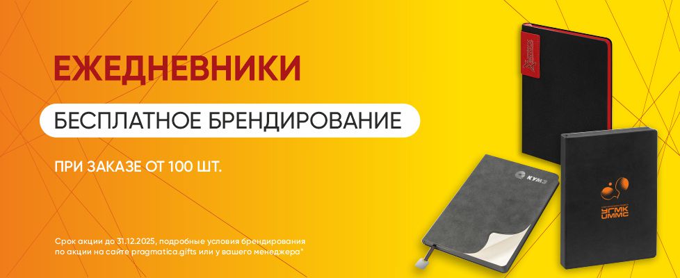 С 1 сентября по 31 декабря 2025 г., при заказе от 100 штук любых ежедневников, нанесение на ежедневники мы делаем в подарок!