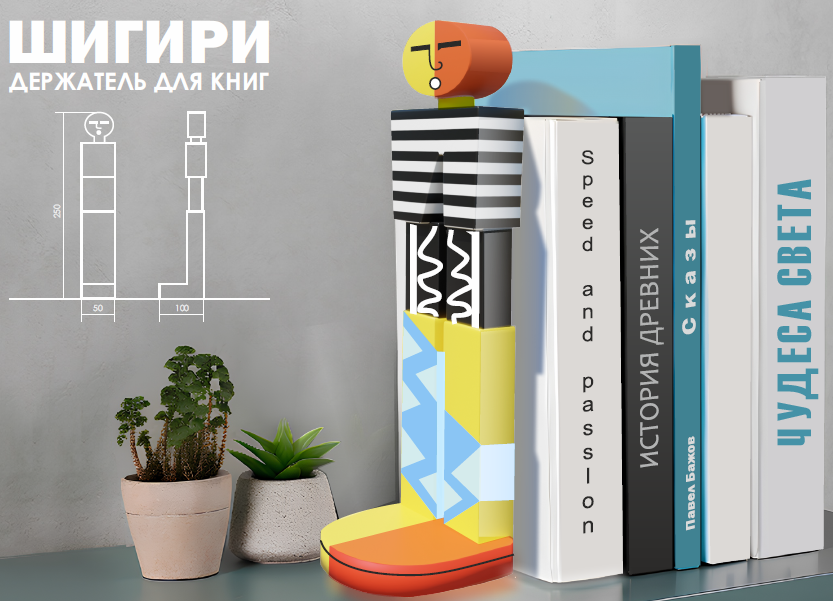 Подставка для книг, стилизованная под Шигирский идол (древнейшая деревянная скульптура, хранится в Музее истории и археологии Среднего Урала, г. Екатеринбург) с нотками поп-арта.