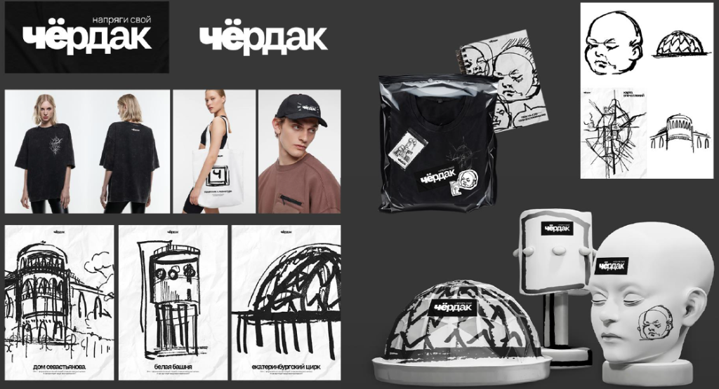 Коллекция одежды и подарочных сувениров в тематике "Алешёньки" (Кыштымский карлик, антропоморфный артефакт, представлявший собой мумифицированные останки)