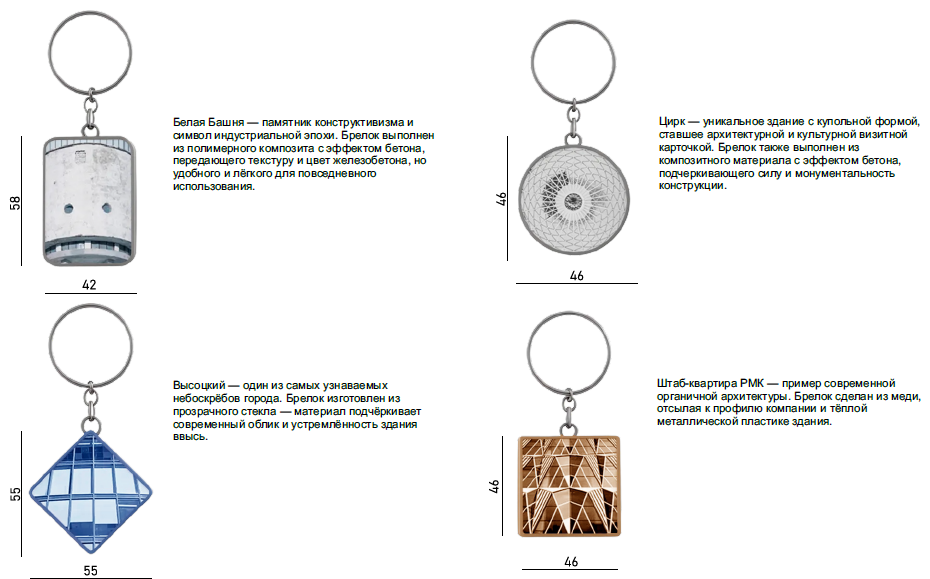 Брелоки, изображающие хорошо известные здания Екатеринбурга