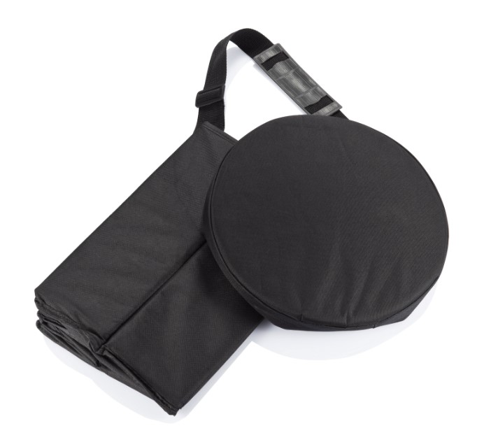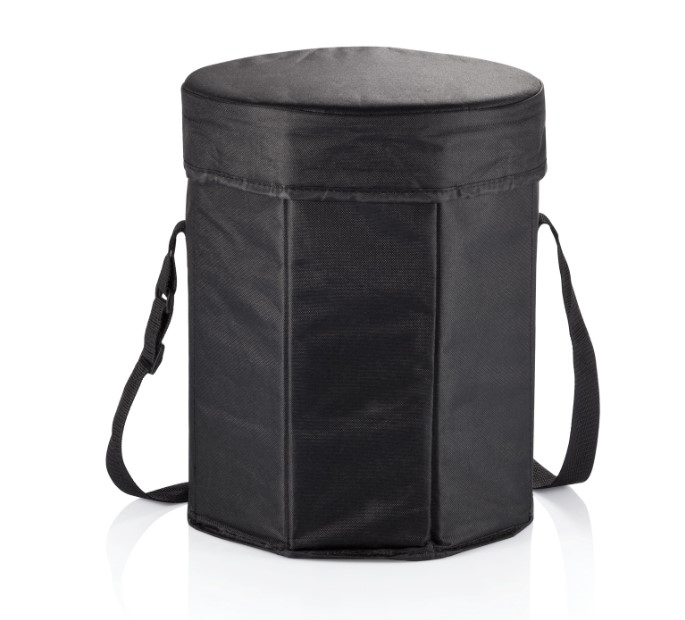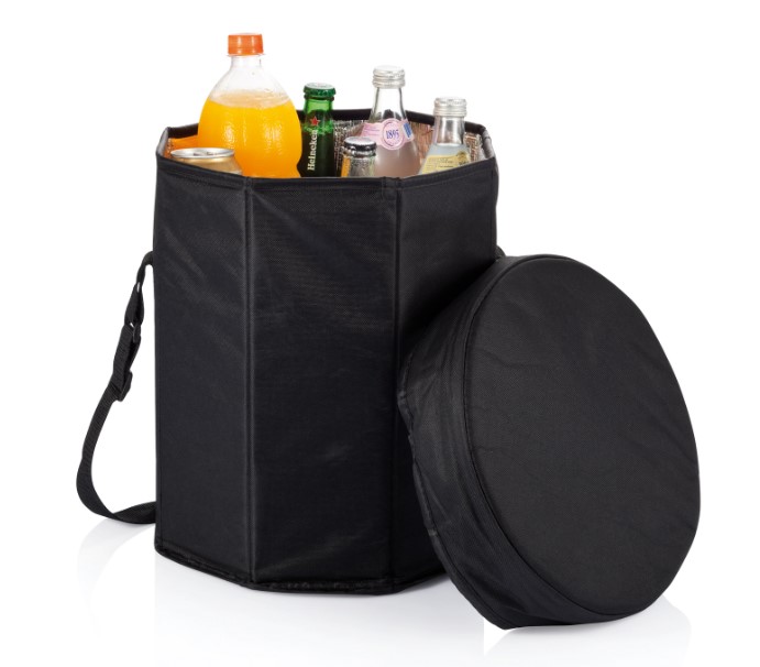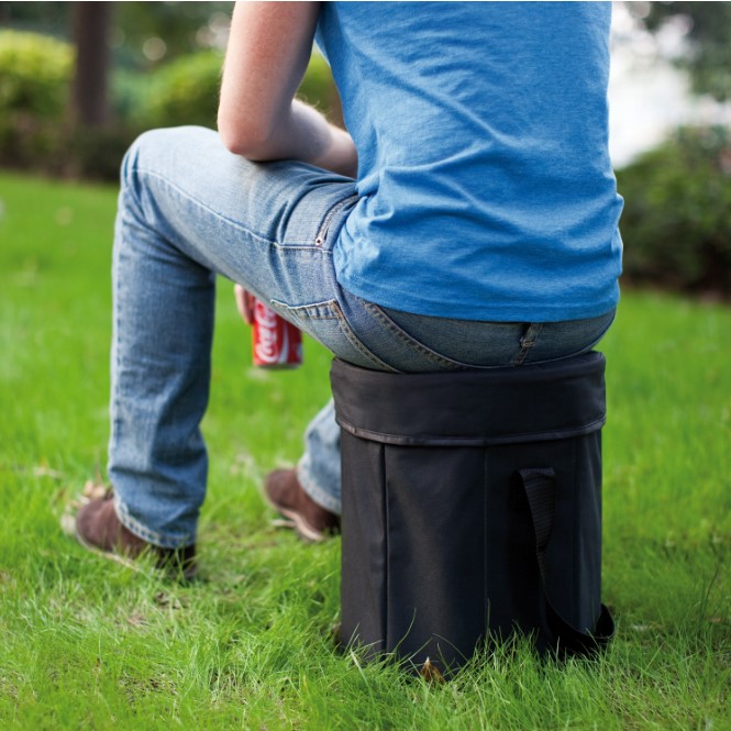 Складная сумка-холодильник с полиэтиленовым покрытием. Разложенная сумка с закрытой крышкой превращается в табурет диаметром 30 см. Удобно использовать и в качестве холодильника, и в качестве табурета.