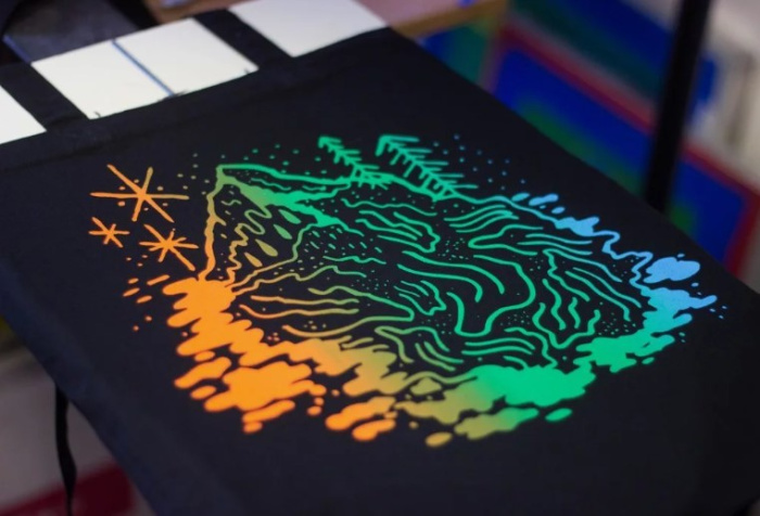 - Нанесение слоёв. В зависимости от количества цветов и сложности дизайна используется несколько трафаретов и слоёв. Каждый слой прокатывается отдельно, после чего изделие подвергается сушке.